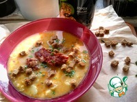 Описание: Ароматный копченый гороховый суп с ржаными сухариками с легким ароматом хрена!