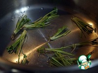 На дно кастрюли или казана, в котором будете готовить, выложить стебли кинзы. |