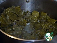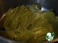 Виноградные листья вынуть из банки, разделить. Самыми маленькими выстелить дно кастрюли. |