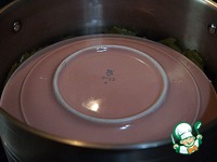 Сверху уложить тарелку, чтобы рулетики не раскрылись. |