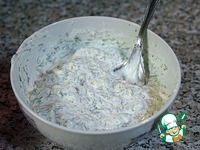 Тем временем приготовить соус. Для этого раздавить очищенные зубчики чеснока. Укроп мелко порезать. Смешать со сметаной, слегка посолить, все перемешать тщательно. |