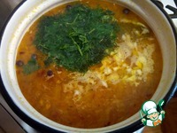 Напоследок добавляем мелко порубленный чеснок, зелень и выключаем плиту. Накрываем щи крышкой и даем постоять минут 10, пока накроем стол. |