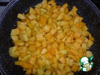 Тыкву нарезаем небольшими кубиками и отправляем на разогретую сковородку с подсолнечным маслом. |
