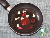 3. На растительном масле обжариваем чеснок и острый перец чили. Затем овощи удаляем, масло оставляем. |