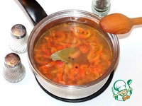 6. Затем кладем заправку, лавровый лист, перец горошком, по вкусу соль и молотый перец. |