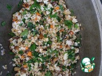 Перемешать всё в кастрюле рис, перловку, грибы с овощами, петрушку. |