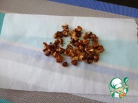 Заранее нужно приготовить карамельные орешки. На сковороду насыпаем сахар и плавим его до бежевого цвета. Затем всыпаем горсть орехов. Хорошо перемешаем, чтобы карамель обволокла орехи. |