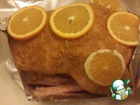 Далее нужно со всех сторон промазать гуся маринадом, разложить по нему кружочки апельсина, упаковать в фольгу и отправить в холодильник мариноваться ( желательно на ночь- сутки). |