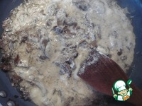 На прогретую сковороду с растительным маслом отправляем грибы. И тушим их. Так как грибы у меня магазинные я лишнюю воду из сковороды выливаю. |