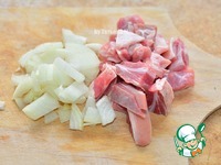 Духовку разогреть до 200 градусов. Баранину порезать на маленькие кусочки, порезать лук. |