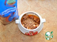 В горшочки (у меня 2), выложить зажарку, добавить по 1 ст. л. гречки. |