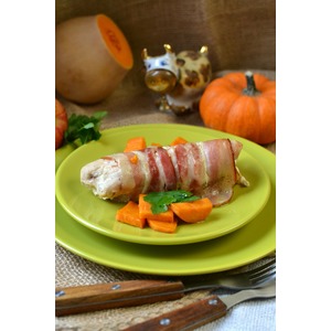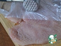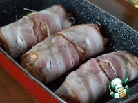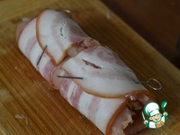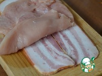 На разделочную доску выкладываем два ломтика-кусочка бекона. Сверху на бекон выкладываем куриное филе. |