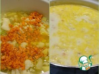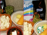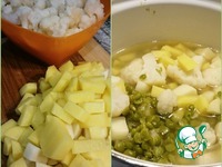 По истечении 30 минут горох посолить, добавить порезанный мелкими кубиками картофель и разобранную на соцветия цветную капусту. Проварить еще 15 минут. |