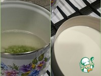 Промытый горох помещаем в кастрюлю с водой, доводим до кипения и после закипания варим 30 мин. Молоко кипятим в отдельной кастрюле, снимаем пенку и отставляем. |