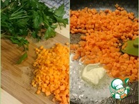 Пока горох варится, надо нарезать морковь мелкими кубиками и спассеровать на сливочном масле в сковороде. |