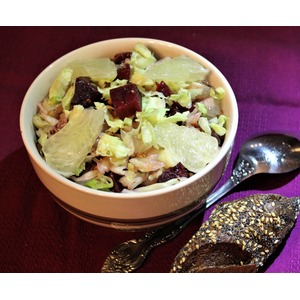 Описание: Приятный и свежий салат с запеченой свеклой. Сначала я скептически отнеслась к сочетанию свеклы и цитруса, а напрасно! Спасибо моей лени - винегрет делать не очень-то хотелось. Был найден легкий в приготовлении свекольный салат. Попробуйте!
