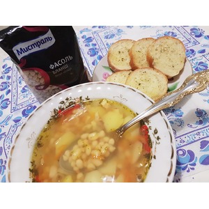 Перед приготовлением фасоль замочить не менее чем на 4 часа. Я использовала белую фасоль "Бланш" ТМ "Мистраль", она имеет сливочный вкус. Варим фасоль в бульоне часа 1,5 на слабом огне. |