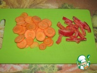 Сладкий перец нарезать соломкой (у меня замороженный). Морковь нарезать кружками или брусочками. |