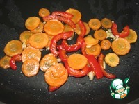 Морковь и перец обжарить в небольшом количестве растительного масла до мягкости. В конце добавить измельченный чеснок, перемешать и убрать огонь. |
