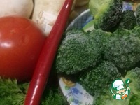 Лук поджарить на растительном масле, добавить нарезные грибы. С помидора снять кожицу, измельчить. Помидор, брокколи и зелень добавить к грибам и тушить все вместе минут 10. |