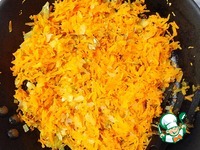 Морковь почистить, натереть на крупной тёрке, добавить к луку и обжаривать на маленьком огне до золотистости. |