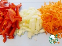 Лук, морковь очистить. Лук мелко нарезать, морковь натереть на крупной терке. Сладкий болгарский перец очистить от семян и нарезать соломкой. |