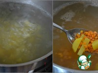 В кастрюлю с кипящей водой положить нарезанный брусочками картофель и варить его до готовности. Затем выложить в кастрюлю чечевицу. Варить минут пять. |