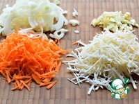 Морковь, сельдерей и чеснок нарезать тонкой соломкой, лук - полукольцами. |