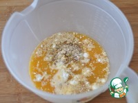 Добавляем свеже-выжатый апельсиновый сок, дробленные грецкие орехи, растительное масло и разрыхлитель. Всё перемешиваем блендером до однородности. |
