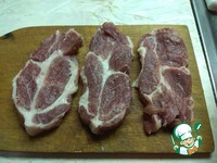 Свинину разрезать на порционные кусочки толщиной примерно в палец. Очень хорошо получается корейка, но у меня в этот раз была шея, при чем не самая удачная (жирноватая). |