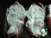 Мясо приправляю и солю с обеих сторон. Оставляю минут на 15-20. Для этого блюда использую только соль и смесь перцев, потому что вкусы и так получаются насыщенные. |