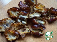 Сухофрукты хорошо промыть. Курагу и чернослив залить кипятком и оставить минут на 15. Затем воду слить, сухофрукты обсушить и нарезать кусочками. |