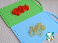Овощи: стебель сельдерея, морковь, стручковую фасоль, болгарский перец отварить до мягкости. С болгарского перца снять кожицу. Нарезать мелкими кубиками болгарский перец, стебель сельдерея. |