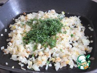 Пока тесто подходит делаю начинку. Репчатый лук мелко режу. В сковороду вливаю растительное масло, кладу лук и обжариваю до золотистого цвета. В конце добавляю измельчённый укроп и перемешиваю. |