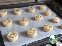 Сворачиваю тесто с луковой начинкой в рулет (начиная с широкого края). |
