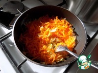 Очередь моркови. Обжарила её с минуту вместе с луком и капустой. Убавила огонь на минимум, накрыла крышкой и потомила минут 15-почти до готовности. |