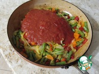 Добавить томатную пассату (пассерованые томаты или соус на выбор), количество зависит от вкусовых характеристик и густоты. По необходимости добавить воду, соль, паприку. |