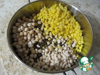 Для приготовления использую 3-х литровый сотейник. Нут, фасоль хранятся готовые к употреблению в морозильной камере, насыпаю по горсти, добавляю 1 банку сладкой кукурузы молочной спелости. |