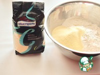Поскольку рецепт постный, то тесто будем готовить постное. Просейте в миску 300 г муки, добавьте семолину и соль, перемешайте. |