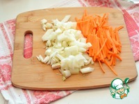 Начинаем готовить плов. Лук нарежьте средним кубиком, морковь - соломкой. Нарубите мелко 3 зубчика чеснока |
