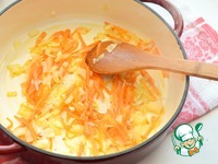 В глубоком сотейнике раскалите масло, поджарьте лук и морковь, в конце добавьте чеснок |