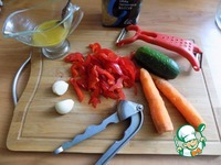 Морковь и огурец натираем на корейской тёрке. Если таковой нет, то огурец режем тонкими полосками, а морковь натираем на средней тёрке. Чеснок давим или очень мелко рубим. Выкладываем в салатник. |