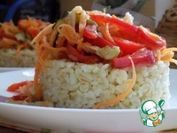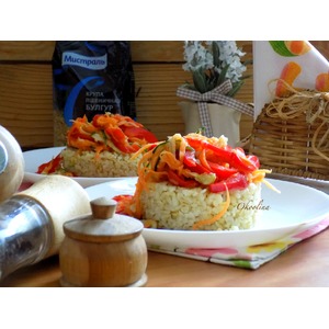 Описание: Овощной салат с морковью, огурцом и болгарским перцем на подушке из булгура. Пикантно, просто замечательно!
