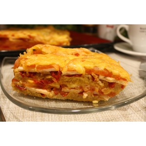 Вот такой получается толстый, слоёный бутерброд. Отправляем в разогретую духовку минут на тридцать до образования красивой поджаристой корочки. |