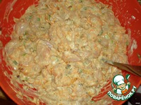 В отдельную посуду мелко нарезать филе птички, добавить соль, перец, майонез, яйца, манку и крахмал. Затем добавить обжаренные овощи. |