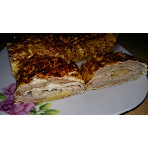 На лист лаваша равномерно распределяем творожную массу. От края отступить по 0.5 см. с каждой стороны. С одной стороны выкладываем порезанные яблоки. И начинаем заворачивать наш рулет. Советую заворачивать и края, чтобы творожная масса не вытекла. Смазываем желтком полностью рулет и отправляем в духовку при 180° на 10-15 минут. По истечении времени дать полностью остыть. можно после остывания украсить шоколадом (я в этот раз совсем немного обмазала горьким шоколадом)
