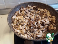 Очищенные грибы нарезать пластинками и обжарить на сухой сковороде до полного испарения жидкости. |