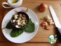 Салат я буду собирать слоями для подачи. Воспользуюсь кольцом. На тарелки выкладываю по 3 листика шпината. Нижний слой-рис с изюмом. Поливаем немного заправкой. |