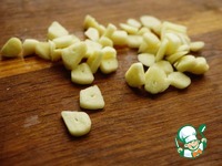 Чеснок это такая штука, которая может быть, как приправой, так и овощем. В заливке он у нас выступает приправа. А еще 4 зубчика будут выступать, как овощи. Режем их пластинками. |