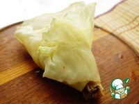 Нижней частью накрываем голубец, хорошенько его подтягиваем и переворачиваем голубец швами вниз. |